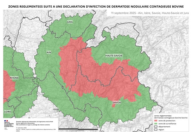 l’Ain et de l’Isère. La vaccination des bovins dans cette zone est obligatoire
